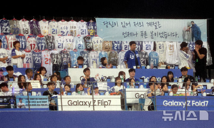 [대구=뉴시스] 이무열 기자 = 30일 대구 수성구 삼성라이온즈파크에서 열린 2025 신한 SOL 뱅크 KBO리그 KIA 타이거즈와 삼성 라이온즈의 경기, 삼성 오승환의 등번호가 새겨진 유니폼이 외야 관중석에 걸려 있다. 2025.09.30. [email protected]