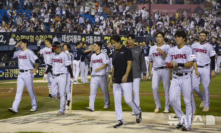 [서울=뉴시스] 김근수 기자 = 30일 오후 서울 송파구 잠실야구장에서 열린 2025 KBO리그 LG 트윈스와 두산 베어스의 경기에서 LG 트윈스가 두산 베어스에게 6-0으로 패배했다. LG 트윈스 선수들이 아쉬워하며 경기장을 빠져나가고 있다. 2025.09.30. [email protected]