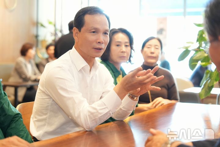 [음성=뉴시스] 조병옥(왼쪽) 충북 음성군수가 1일 음성군 삼성면의 한 카페에서 지역 사회단체장들과 현안 사업에 대해 대화를 나누고 있다. 조 군수는 이날 3차 '찾아가는 군정, 머무르는 소통' 현장간담회를 진행해 군민들의 목소리를 청취했다. (사진=음성군 제공) 2025.10.01. [email protected]