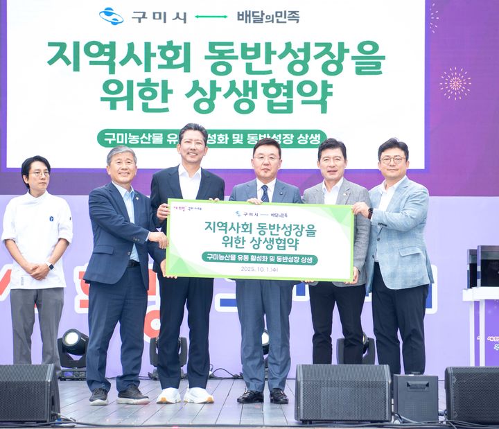 [구미=뉴시스] 박홍식 기자 = 김장호(왼쪽 세번째) 경북 구미시장이 1일 서울광장에서 열린 '2025 구미 푸드 페스티벌' 행사에 앞서 '배달의민족'과 구미 농산물 유통 활성화 및 동반성장 상생을 위한 업무협약을 체결하고 있다. (사진=구미시 제공) 2025.10.01 [email protected]