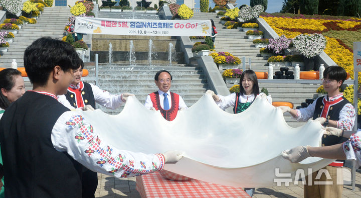 [임실=뉴시스] 김얼 기자 = 심민(가운데) 임실군수를 비롯한 관계자들이 1일 전북 임실군 임실치즈테마파크에서 열린 '2025 임실N치즈축제 개막 사전행사'에 참석해 저지종으로 만든 모짜렐라 치즈를 늘리며 환하게 웃고 있다. 2025 임실N치즈축제는 8일부터 12일까지 5일간 임실치즈테마파크 일원에서 열린다. 2025.10.01. [email protected]