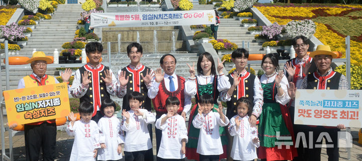 [임실=뉴시스] 김얼 기자 = 심민(윗줄 가운데) 임실군수를 비롯한 관계자들이 1일 전북 임실군 임실치즈테마파크에서 열린 '2025 임실N치즈축제 개막 사전행사'에 참석해 기념촬영을 하고 있다. 2025 임실N치즈축제는 8일부터 12일까지 5일간 임실치즈테마파크 일원에서 열린다. 2025.10.01. [email protected]