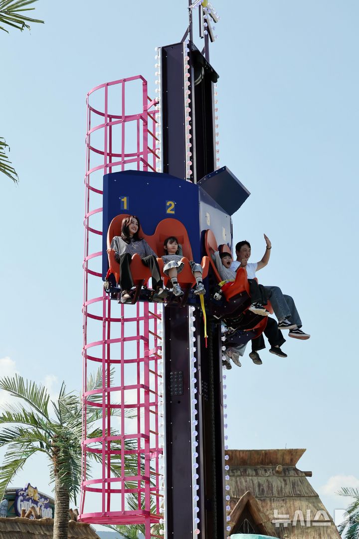 [부산=뉴시스] 하경민 기자 = 1일 부산 기장군 롯데월드 어드벤처 부산을 찾은 시민들이 약 10m 높이까지 수직 상승과 하강을 반복하는 놀이기구 '뱅앤드롭'을 즐기고 있다.