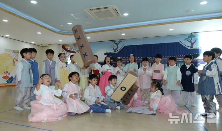 [울산=뉴시스] 배병수 기자 = 추석 명절을 앞둔 1일 오전 울산 중구 아리솔유치원에서 어린이들이 한복을 입고 윷놀이를 하고 있다[email protected].