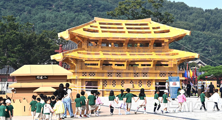 [수원=뉴시스] 김종택 기자 = 제62회 수원화성문화제가 열린 1일 경기 수원시 화성행궁 광장에 시민들이 종이 박스로 제작한 수원화성 팔달문이 전시돼 있다.
