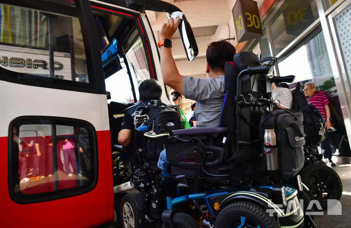 [광주=뉴시스] 김혜인 기자 = 광주·전남장애인차별철폐연대가 1일 오후 광주 서구 유스퀘어 광장 앞에서 '시외고속 리프트 도입 촉구 전국 동시다발 기자회견'을 열고 버스 탑승 시위를 벌이고 있다. 2025.10.01. [email protected]
