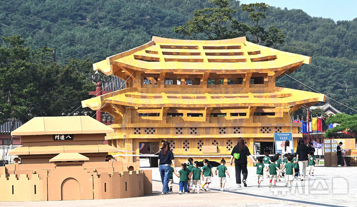 [수원=뉴시스] 김종택 기자 = 제62회 수원화성문화제가 열린 1일 경기 수원시 화성행궁 광장에 시민들이 종이 박스로 제작한 수원화성 팔달문이 전시돼 있다.