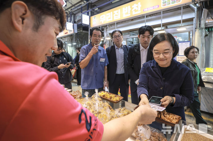 [서울=뉴시스] 정병혁 기자 = 한성숙 중소벤처기업부 장관이 추석맞이 성수품 수급상황 및 물가동향 점검을 위해 1일 서울 서대문구 영천시장을 찾아 한과을 구매하고 있다. 2025.10.01 [email protected]