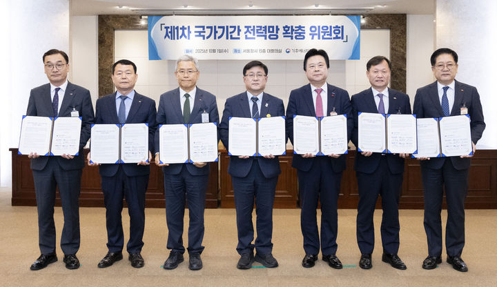 왼쪽부터 정인노 한국농어촌공사 부사장, 윤석대 한국수자원공사 사장, 김동철 한국전력공사 사장, 김성환 기후에너지환경부장관, 강기윤 한국남동발전 사장, 이정복 한국서부발전 사장, 권명호 한국동서발전 사장. (사진=기후에너지환경부 제공) 2025.10.01. [email protected]
