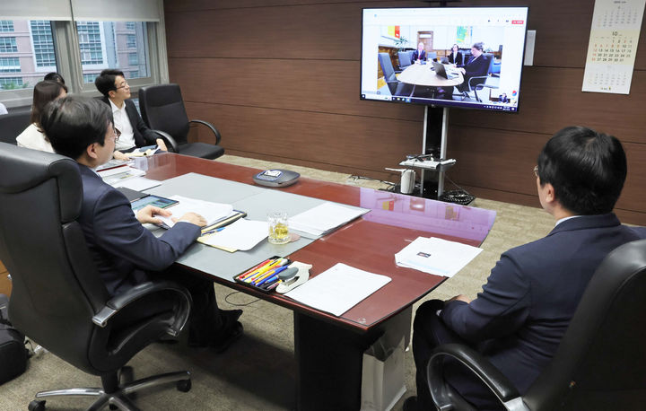 [서울=뉴시스] 홍효식 기자 = 여한구 산업통상부 통상교섭본부장이 1일 서울 중구 대한상공회의소에서 크리스 브라이언트(Chris Bryant) 영국 기업통상부 통상 담당장관과 화상으로 면담을 갖고, 한-영 양국 간 협력 확대 방안과 글로벌 통상환경에서의 주요 통상 현안에 대해 의견을 교환하고 있다. (사진=산업통상부 제공) 2025.10.01. [email protected] *재판매 및 DB 금지