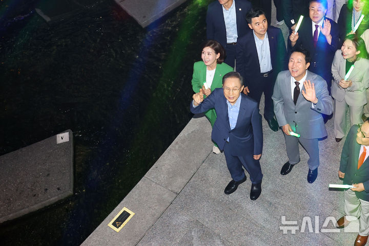 [서울=뉴시스] 박주성 기자 = 1일 오후 서울 청계광장에서 열린 청계천 복원 20주년 행사를 마친 오세훈 시장과 이명박 전 대통령을 비롯한 내빈들이 청계천을 산책하고 있다. 2025.10.01. [email protected]