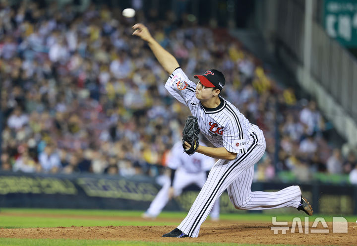 [서울=뉴시스] 이영환 기자 = 1일 오후 서울 송파구 잠실야구장에서 열린 2025 KBO 리그 NC 다이노스와 LG 트윈스의 경기, 6회초 마운드에 오른 LG 김영우가 공을 던지고 있다. 2025.10.01. [email protected]