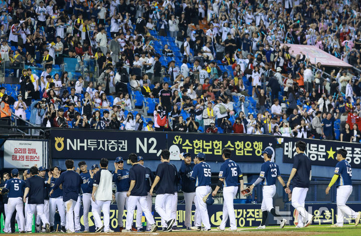 [서울=뉴시스] 이영환 기자 = 1일 오후 서울 송파구 잠실야구장에서 열린 2025 KBO 리그 NC 다이노스와 LG 트윈스의 경기, 7-3으로 승리한 NC 이호준 감독이 선수들을 격려하고 있다. 2025.10.01. [email protected]
