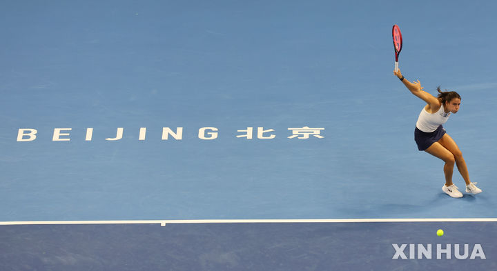 [베이징=신화/뉴시스] 에마 나바로(17위·미국)가 1일(현지 시간) 중국 베이징에서 열린 여자프로테니스(WTA) 투어 차이나오픈(WTA1000) 단식 16강전에서 이가 시비옹테크(2위·폴란드)와 경기하고 있다. 나바로가 2-1(6-4 4-6 6-0)로 시비옹테크를 꺾고 8강에 합류했다. 2025.10.02.