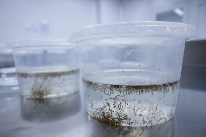 [캄피나스=AP/뉴시스] 1일(현지 시간) 브라질 상파울루주 캄피나스의 한 연구실 실험 용기에 뎅기열 차단 박테리아 '볼바키아'(Wolbachia)에 감염된 집모기 유충들이 담겨 있다. 브라질 보건당국은 뎅기열뿐만 아니라 지카, 치쿤구니야 등의 질병을 예방할 수 있는 '볼바키아' 감염 모기를 실험실에서 배양, 방사해 지역 모기 개체군과 교배시켜 질병을 예방하도록 하고 있다. 세계보건기구(WHO) 자료에 따르면, 브라질에서는 지난해 6천297명이 뎅기열로 사망했다. 2025.10.02.