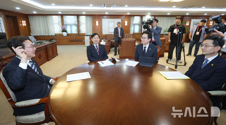 [서울=뉴시스] 청사사진기자단 = 김민석(왼쪽) 국무총리가 2일 오전 서울 종로구 정부서울청사에서 구윤철(왼쪽 두번쨰) 경제부총리 겸 기획재정부 장관, 배경훈(왼쪽세번쨰) 과기부총리 겸 과학기술정보통신부 장관), 윤창렬 국무조정실장과 제1회 3+@ 회의를 하고 있다. 2025.10.02. [email protected]
