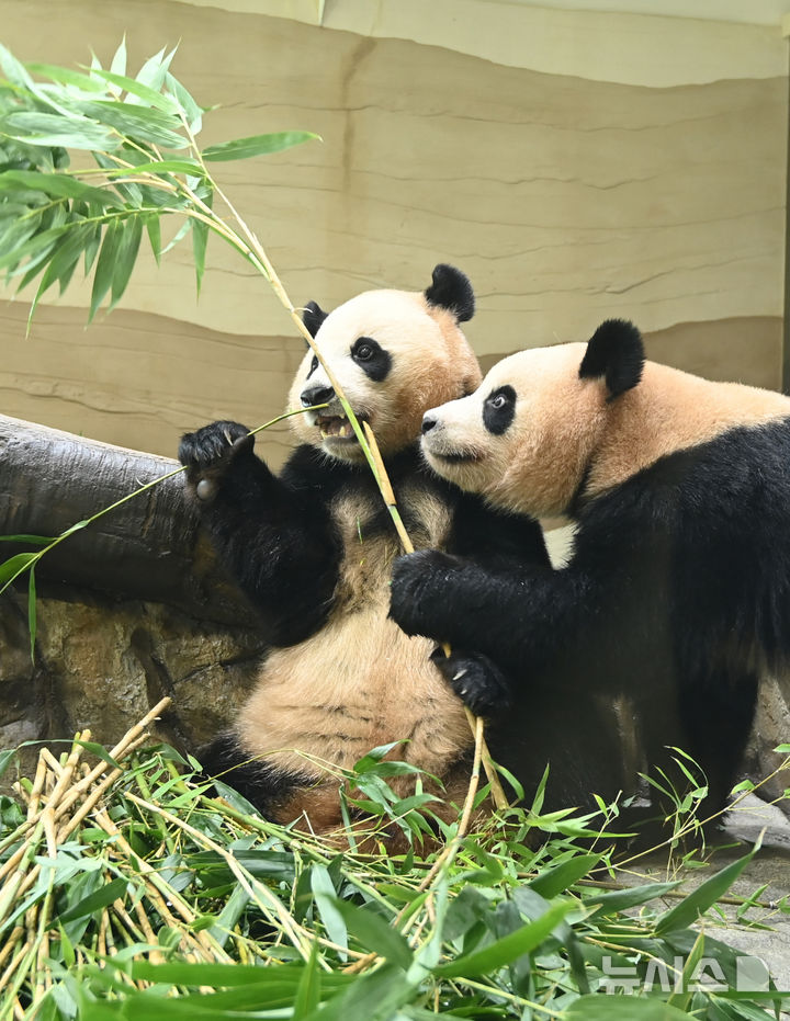 [용인=뉴시스] 김종택 기자 = 국내에서 태어난 최초의 쌍둥이 판다 루이바오·후이바오가 2일 경기 용인시 에버랜드내 새로운 보금자리인 '판다 세컨드하우스'에서 먹이를 먹고 있다.
