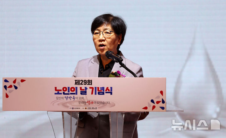[서울=뉴시스] 홍효식 기자 = 정은경 보건복지부 장관이 2일 서울 중구 롯데호텔에서 열린 제29회 노인의 날 기념식에서 이재명 대통령의 축사를 대독하고 있다. 2025.10.02. [email protected]