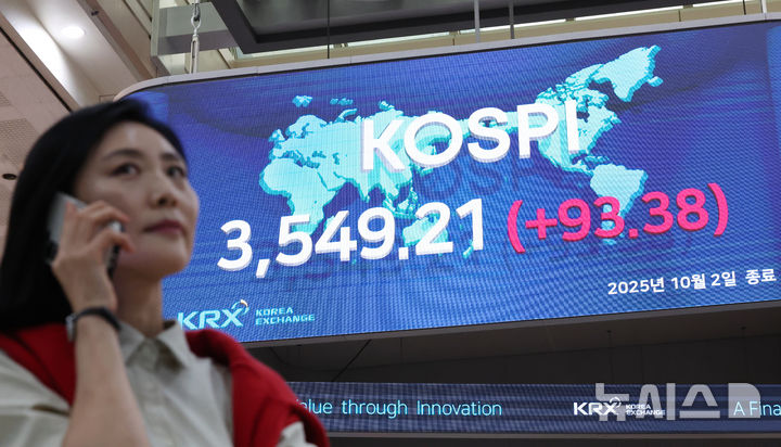 [서울=뉴시스] 홍효식 기자 = 코스피가 전 거래일(3455.83)보다 93.38포인트(2.70%) 상승한 3549.21에 마감한 2일 오후 서울 영등포구 한국거래소 서울사무소 홍보관에 지수가 표시되고 있다.