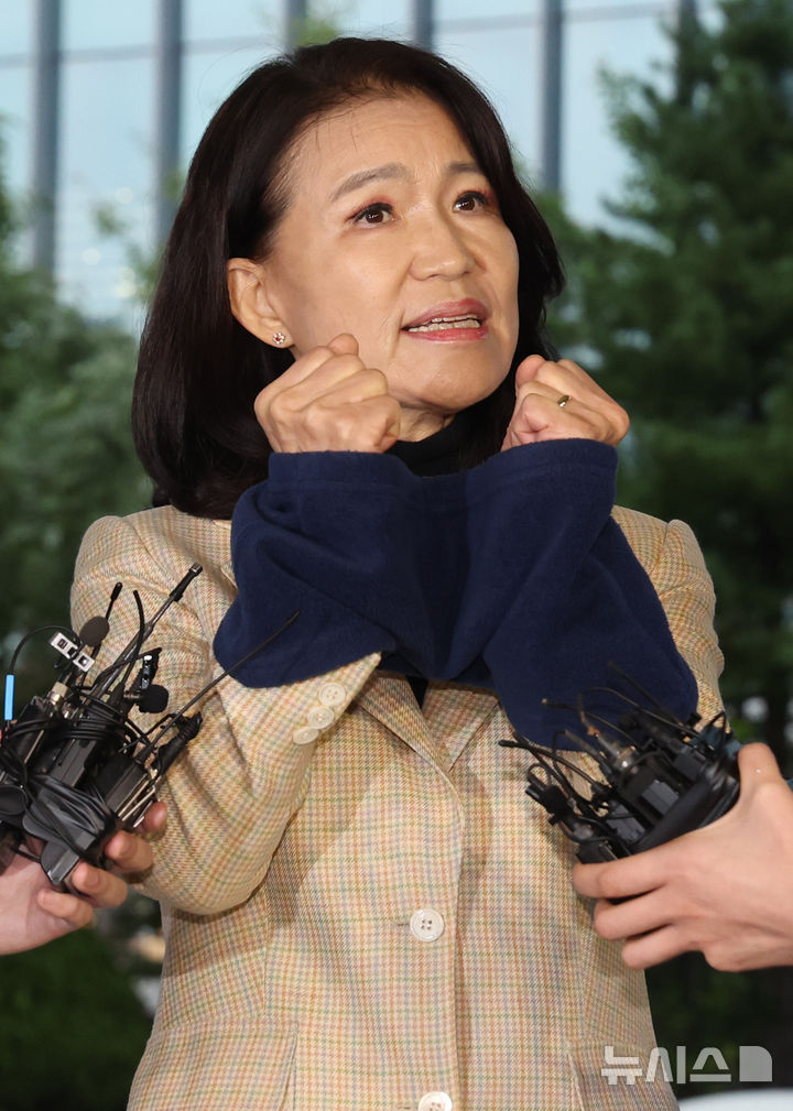 [서울=뉴시스] 홍효식 기자 = 공직선거법·국가공무원법 위반 등 혐의로 체포된 이진숙 전 방송통신위원장이 2일 서울 영등포경찰서로 압송되고 있다. 2025.10.02. [email protected]