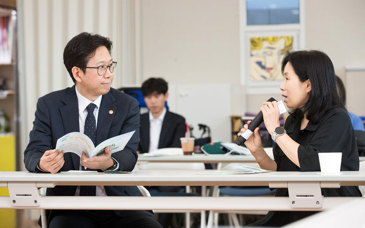 [서울=뉴시스] 조성우 기자 = 배경훈 부총리 겸 과학기술정보통신부 장관이 2일 서울 용산구 사회복지시설 영락애니아의집에 방문해 조지영 시설장의 애기를 듣고 있다. (사진=과학기술정보통신부 제공) 2025.10.02. [email protected] *재판매 및 DB 금지