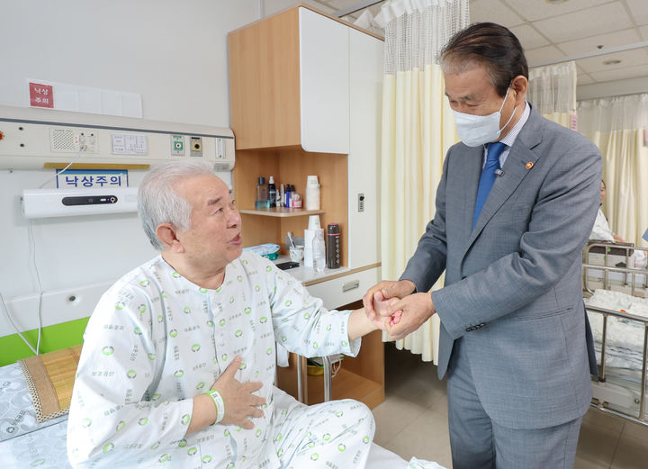 [서울=뉴시스] 조성우 기자 = 권오을 국가보훈부 장관이 2일 대구 달서구 대구보훈병원을 방문해 입원 중인 국가유공자를 만나 위문하고 있다. (사진=국가보훈부 제공) 2025.10.02. [email protected] *재판매 및 DB 금지