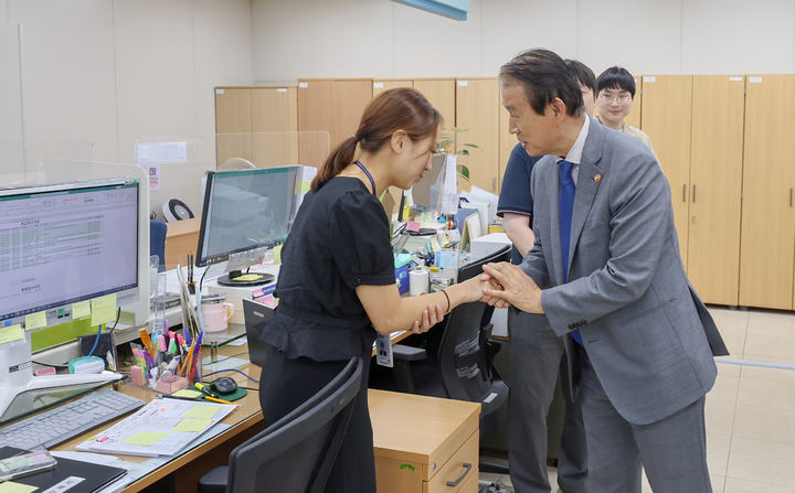 [서울=뉴시스] 조성우 기자 = 권오을 국가보훈부 장관이 2일 대구지방보훈청을 방문해 보훈행정시스템 장애에 따른 현장 상황 점검을 하고 있다. (사진=국가보훈부 제공) 2025.10.02. [email protected] *재판매 및 DB 금지