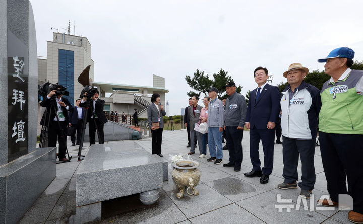 [인천=뉴시스] 고범준 기자 = 이재명 대통령이 3일 인천 강화군 강화평화전망대에서 실향민 및 가족과 망배단 설명을 듣고 있다. 2025.10.03. [email protected]