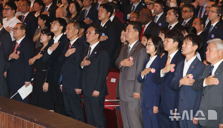 [서울=뉴시스] 홍효식 기자 = 김민석 국무총리를 비롯한 김병기 더불어민주당 원내대표, 김재연 진보당 상임대표, 이준석 개혁신당 대표, 한창민 사회민주당 대표, 서왕진 조국신당 원내대표 등 참석자들이 3일 서울 종로구 세종문화회관에서 열린 제4357주년 개천절 경축식에서 국기에 대한 경례를 하고 있다. 2025.10.03. [email protected]