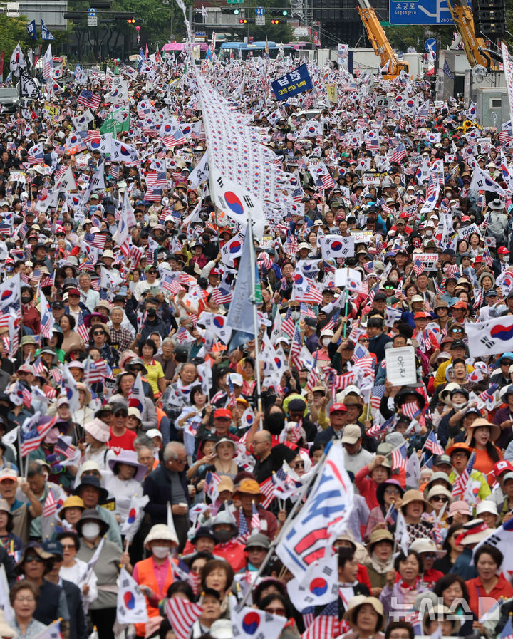 [서울=뉴시스] 황준선 기자 = 3일 오후 서울 중구 세종대로에서 자유통일당 등 보수단체 회원들이 10.3 국가정상화를 위한 광화문 국민대회를 하고 있다. 2025.10.03. [email protected]