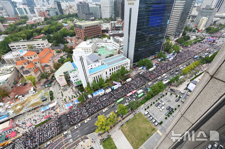 [서울=뉴시스] 황준선 기자 = 3일 오후 서울 중구 세종대로에서 자유통일당 등 보수단체 회원들이 10.3 국가정상화를 위한 광화문 국민대회를 하고 있다. 2025.10.03. [email protected]