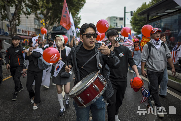 [서울=뉴시스] 정병혁 기자 = 3일 서울 종로구 동대문역 인근에서 열린 자유대학 정부 규탄 집회에서 참가자들이 피켓을 들고 광화문 방향으로 행진하고 있다. 2025.10.03. [email protected]