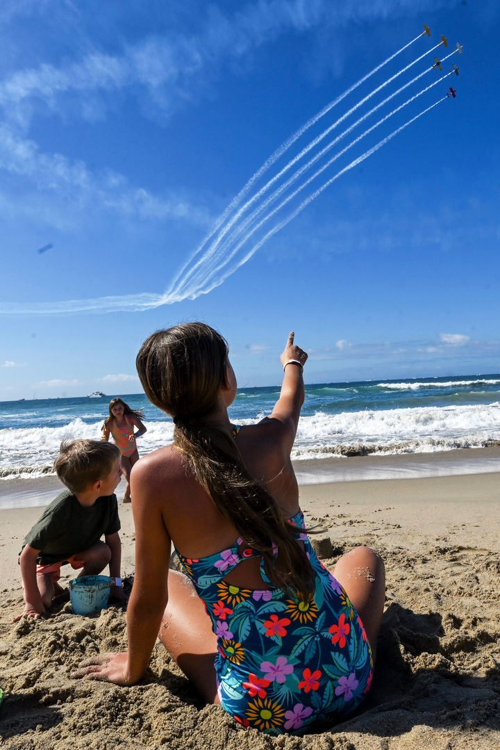 [헌팅턴비치=AP/뉴시스] 3일(현지 시간) 미 캘리포니아주 헌팅턴비치에서 물놀이를 즐기던 어린이들이 이날 열린 '퍼시픽 에어쇼'에서 곡예비행을 펼치는 돈 패트롤(Dawn Patrol) 팀을 바라보고 있다. 5일까지 열리는 이번 에어쇼에는 연방정부 셧다운으로 인해 미군 비행기는 불참한다. 2025.10.04.