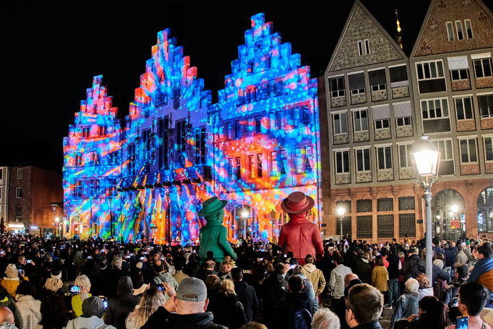 [프랑크푸르트=AP/뉴시스] 3일(현지 시간) 독일 프랑크푸르트 시청 앞에서 시민들이 독일 통일 35주년을 기념하는 빛의 향연을 즐기고 있다. 독일은 1989년 11월 9일 베를린 장벽 붕괴 이듬해인 1990년 10월 3일 공식적으로 통일이 이루어졌다. 2025.10.04.