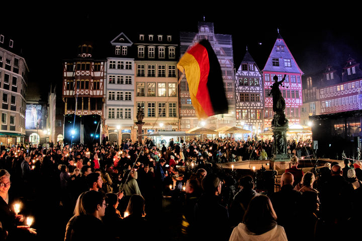 [프랑크푸르트=AP/뉴시스] 3일(현지 시간) 독일 프랑크푸르트 시청 앞에서 시민들이 독일 통일 35주년을 축하하고 있다. 독일은 1989년 11월 9일 베를린 장벽 붕괴 이듬해인 1990년 10월 3일 공식적으로 통일이 이루어졌다. 2025.10.04.