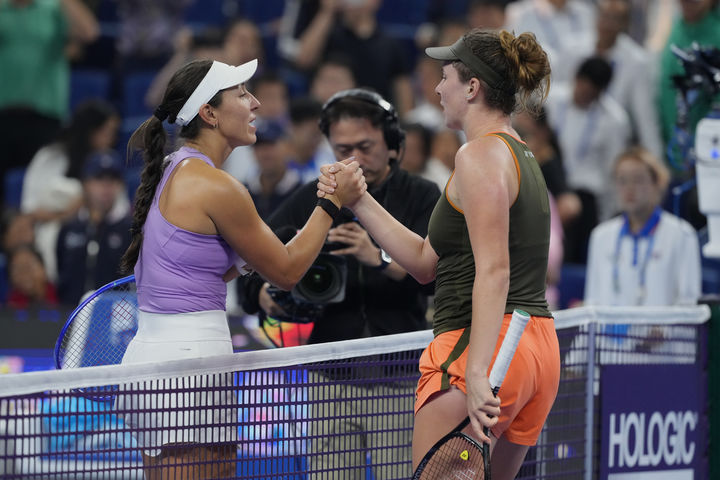 [베이징=AP/뉴시스] 린다 노스코바(27위·체코, 오른쪽)가 4일(현지 시간) 중국 베이징에서 열린 여자프로테니스(WTA) 투어 차이나오픈(WTA1000) 단식 준결승에서 제시카 페굴라(7위·미국)를 꺾은 후 인사를 나누고 있다. 노스코바가 2-1(6-3 1-6 7-6)로 승리하고 결승에 올라 코코 고프(3위·미국)를 꺾고 올라온 어맨다 아니시모바(4위·미국)와 우승을 다툰다. 2025.10.05.