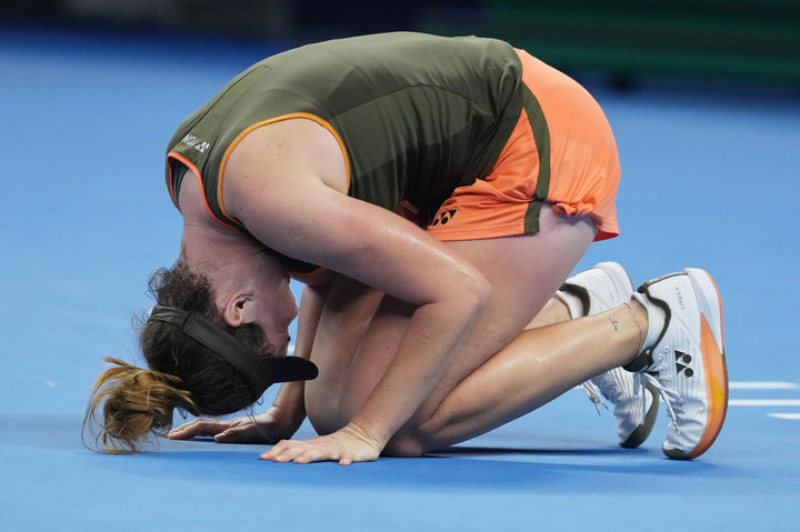 [베이징=AP/뉴시스] 린다 노스코바(27위·체코)가 4일(현지 시간) 중국 베이징에서 열린 여자프로테니스(WTA) 투어 차이나오픈(WTA1000) 단식 준결승에서 제시카 페굴라(7위·미국)를 꺾은 후 환호하고 있다. 노스코바가 2-1(6-3 1-6 7-6)로 승리하고 결승에 올라 코코 고프(3위·미국)를 꺾고 올라온 어맨다 아니시모바(4위·미국)와 우승을 다툰다. 2025.10.05.