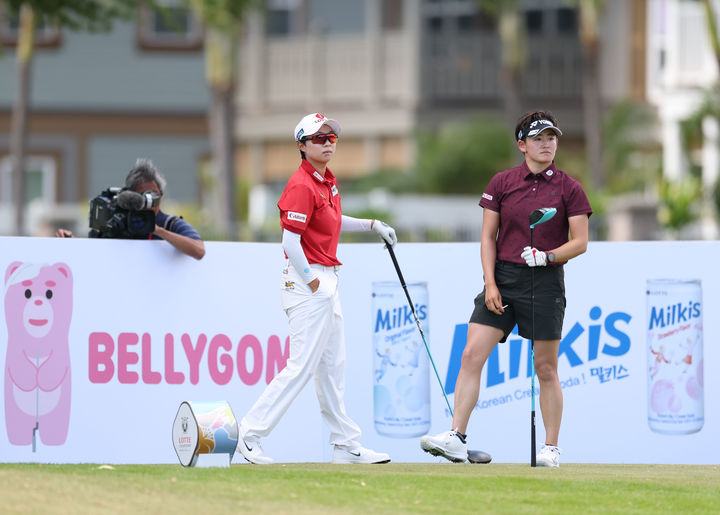 [서울=뉴시스] 김효주와 이와이 아키에가 4일(현지 시간) 하와이 오하우섬 에바비치에 위치한 호아칼레이CC에서 열린 '2025 롯데 챔피언십' FR 2번홀에서 티샷을 준비하고 있다. (사진=대홍기획 제공) 2025.10.05. [email protected] *재판매 및 DB 금지