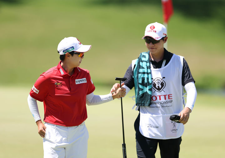 [서울=뉴시스] 김효주가 4일(현지 시간) 하와이 오하우섬 에바비치 호아칼레이CC에서 열린 '2025 롯데 챔피언십' FR 5번홀 버디를 기록한 후 퍼터를 캐디에게 건네고 있다. (사진=대홍기획 제공) 2025.10.05. [email protected] *재판매 및 DB 금지