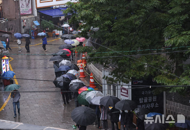 [서울=뉴시스] 최진석 기자 = 추석을 하루 앞둔 5일 서울 종로구 탑골공원 인근 무료급식소 앞에서 어르신들이 줄지어 대기하고 있다. 2025.10.05. [email protected]