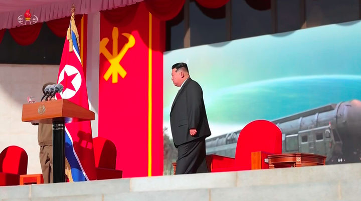 [서울=뉴시스] 조선중앙TV가 4일 김정은 국무위원장이 참석한 평양에서 개막한 무장장비전시회 '국방발전-2025' 개막식을  5일 방송하고 있다. (출처=조선중앙TV 캡쳐) 2025.10.05. [email protected] *재판매 및 DB 금지