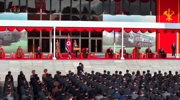[서울=뉴시스] 조선중앙TV가 4일 김정은 국무위원장이 참석한 평양에서 개막한 무장장비전시회 '국방발전-2025' 개막식을 5일 방송하고 있다. (출처=조선중앙TV 캡쳐) 2025.10.05. [email protected] *재판매 및 DB 금지