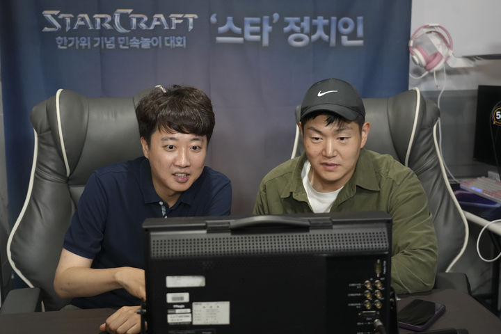 [서울=뉴시스] 김근수 기자 = 이준석 개혁신당 대표와 김재섭 국민의힘 의원이 5일 오후 서울 영등포구의 한 PC방에서 열린 '한가위 기념 민속놀이 대회 스타 정치인' 행사에서 스타크래프트 게임 전 이야기를 나누고 있다. (사진 = 개혁신당 제공) 2025.10.05. [email protected] *재판매 및 DB 금지