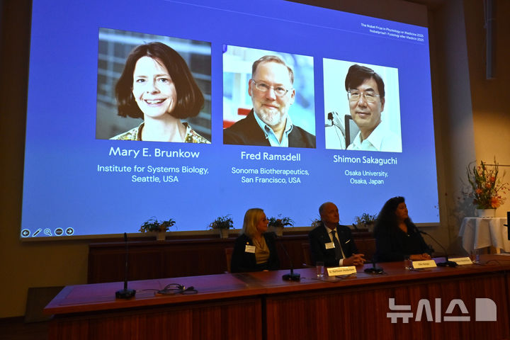 [스톡홀름=AP/뉴시스] 6일(현지시간) 스웨덴 스톡홀름 카롤린스카 연구소에서 열린 노벨상 회의에서 2025년 노벨 생리의학상을 수상자 생물학자 매리 브런코(미국), 프레드 람스델(미국), 사카구치 시몬(일본)가 발표되고 있다. 이들은 '조절 T 세포'가 신체를 공격하지 못하도록 막는다는 사실을 밝혀냄으로써 면역 연구 발전에 기여한 점을 인정받았다. 2025.10.06.