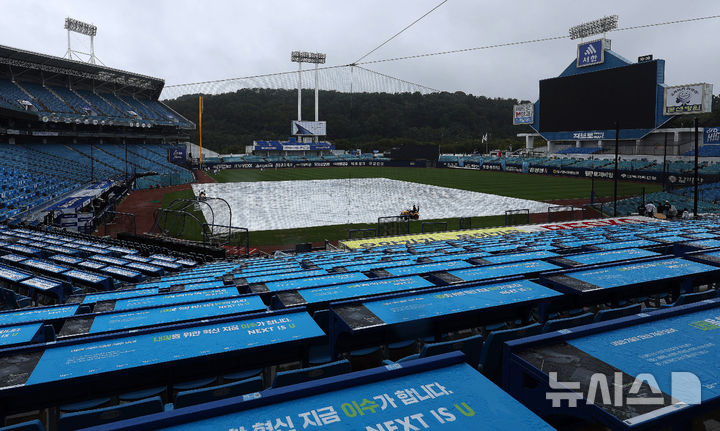 [대구=뉴시스] 이무열 기자 = 6일 대구 수성구 삼성라이온즈파크에서 2025 신한 SOL 뱅크 KBO리그 와일드카드 1차전 NC 다이노스와 삼성 라이온즈의 경기가 예정인 가운데 내리는 비로 인해 그라운드에 방수포가 깔려있다. 2025.10.06. [email protected]