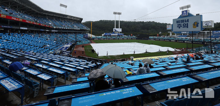 [대구=뉴시스] 이무열 기자 = 6일 대구 수성구 삼성라이온즈파크에서 2025 신한 SOL 뱅크 KBO리그 와일드카드 1차전 NC 다이노스와 삼성 라이온즈의 경기가 예정인 가운데 내리는 비로 인해 그라운드에 방수포가 깔려있다. 2025.10.06. [email protected]