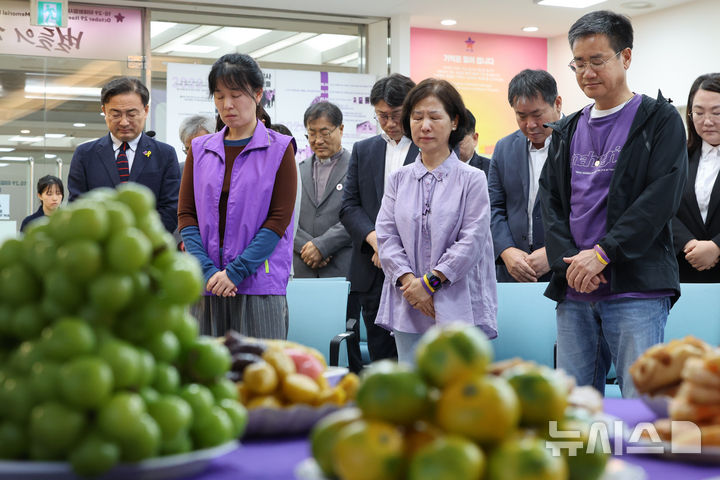 [서울=뉴시스] 황준선 기자 = 추석인 6일 오후 서울 종로구 10.29 이태원참사 기억소통공간 별들의 집에서 열린 10.29 이태원참사 유가족·시민과 함께하는 추석 상차림 행사에서 송해진 10.29 이태원참사 유가족협의회 운영위원장을 비롯한 유가족들이 묵념하고 있다. 2025.10.06. [email protected]