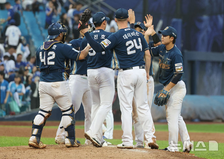 [대구=뉴시스] 이무열 기자 = 6일 대구 수성구 삼성라이온즈파크에서 열린 2025 신한 SOL 뱅크 KBO리그 와일드카드 1차전 NC 다이노스와 삼성 라이온즈의 경기, 4-1로 승리한 NC 선수들이 기뻐하고 있다. 2025.10.06. [email protected]