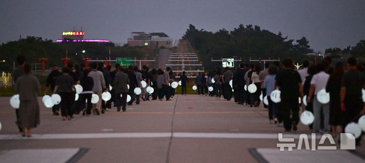 [무안=뉴시스] 이영주 기자 = 추석 당일인 6일 오후 전남 무안군 무안국제공항 활주로에서 12·29 무안공항 제주항공 여객기 참사 유가족협의회가 참사 희생자들의 넋을 위로하며 '기억의 활주로, 별이 된 당신께' 유등행사를 진행하고 있다. 2025.10.06. [email protected]