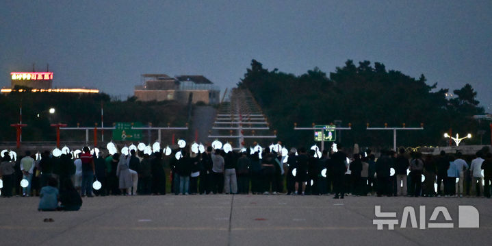 [무안=뉴시스] 이영주 기자 = 추석 당일인 6일 오후 전남 무안군 무안국제공항 활주로에서 12·29 무안공항 제주항공 여객기 참사 유가족협의회가 참사 희생자들의 넋을 위로하며 '기억의 활주로, 별이 된 당신께' 유등행사를 진행하고 있다. 2025.10.06. [email protected]